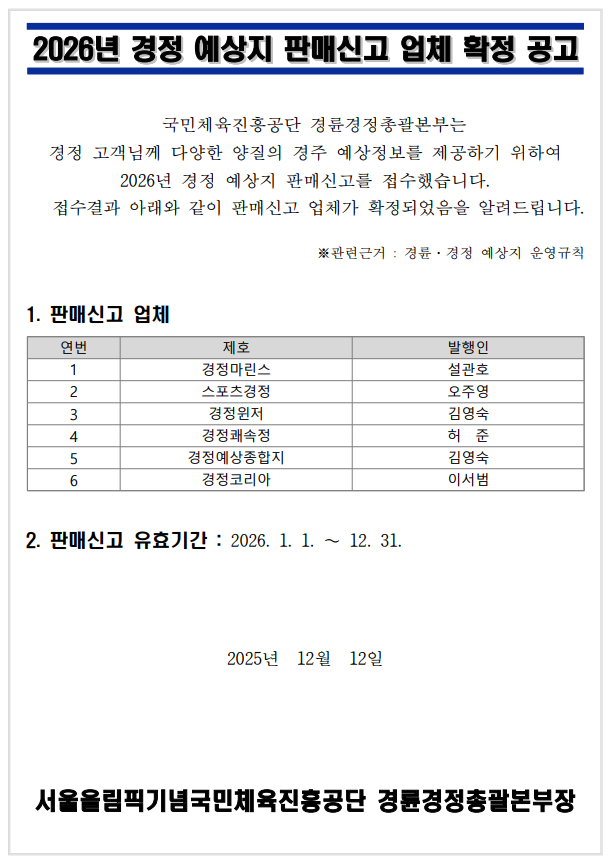 2026년 경정 예상지 판매신고 업체 확정 공고