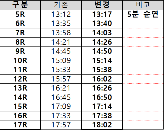 ㅇ 내 용 : 5경주부터 17경주까지 경주시간 5분 순연